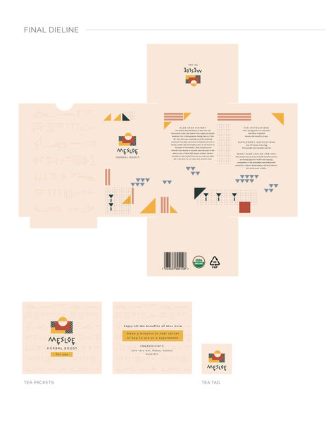 HOW - I created a package that opens with two sides: one for you, and one for the plant. The user will be able to tear down or tear off a tab where the tea packet can be grabbed from. The design is based loosely on Mesopotamia. The name Mesloe combines parts from Mesopotamia and aloe because aloe vera was first discovered in Mesopotamia. The symbols on the packaging are based on the shapes of cuneiform, the alphabet of Mesopotamia. Overall, this packaging has a dual purpose, for you and your plant and is distinguished by the two sides of the packaging.